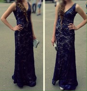 Продам выпускное платье, синего цвета, длинное с небольшим шлейфом и открытой спиной, итальянское красивое кружево, очень красивая отделка спины. Кружево на бежевой.
