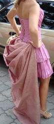 Оригинальное выпускное платье: ткань - жатый атлас, цвет - фрезия, двухслойная юбка с бантом сзади, корсет, шлейф отстёгивающийся. |