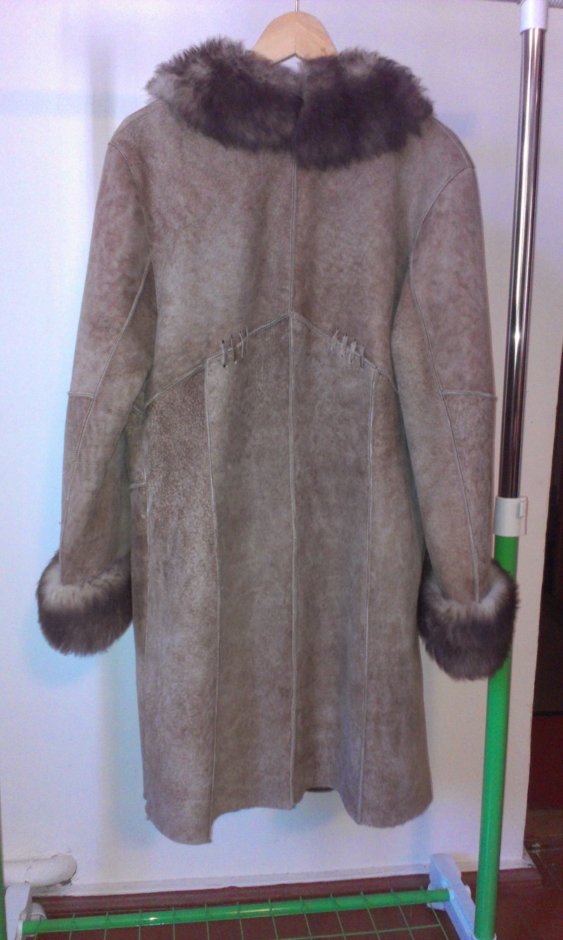 Дубленка в хорошем состоянии, но сломана одна пуговица. Длина 90 см. |