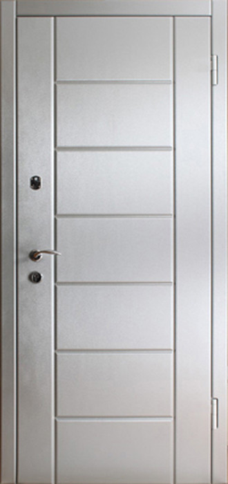 Дверное полотно: Толщина ― 55 мм, толщина металла (наружный лист) ― 1,2 мм, вертикальные и горизонтальные ребра жесткости (металл 1,5 мм), один контур двойного уплотнителя, утепление ― минеральная вата "ISOVER", шариковые петли с углом обзора в 180°