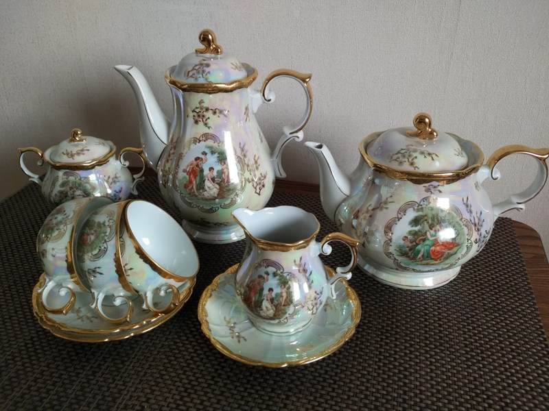 Чайный сервиз Мадонна Oscar Schlegelmilch, оригинал, ГДР Сервиз на 6 персон из тончайшего фарфора с росписью, золотым широким кантом, позолотой и перламутровым покрытием. Отличное состояние. В комплекте: чашки – 6 шт, блюдца – 6 шт, заварник – 1 шт, чайник – 1 шт, сахарница – 1 шт, молочник – 1 шт. С фирменным клеймом производителя. Абсолютно новый. Цена: 9500 грн |