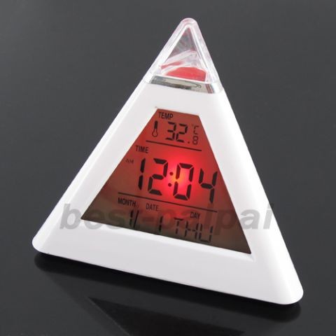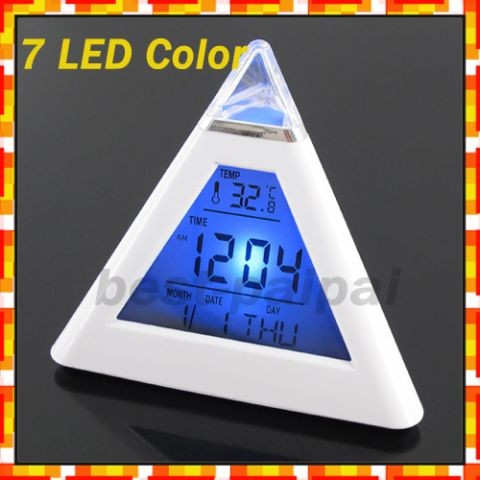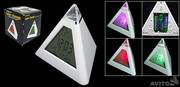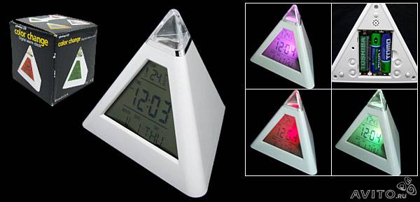 Часы-пирамидка с LED подсветкой Они светятся семью разными цветами и, ночью, могут служить как небольшой ночник. Часы выполнены в удобной и компактной форме пирамиды. Большой жк-экран с огромными цифрами, плюс к этому - отображается дату и температуру. Также есть функция "будильник" с громким сигналом. Во время звонка часы будут активно мигать. Часы питаются как от батареек. Размеры: 8 x 8 см Размер экрана: 5 x 5 см Питание: 3 батарейки ААА для подсветки 2 батарейки AG13/LR44 для часов |